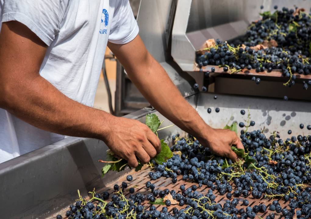 昼夜の温度差を活かし、夜間に収穫されるブドウ。